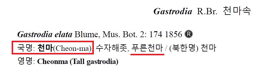 예전의 푸른천마가 개정된 국가표준식물목록엔 천마로 통합됨